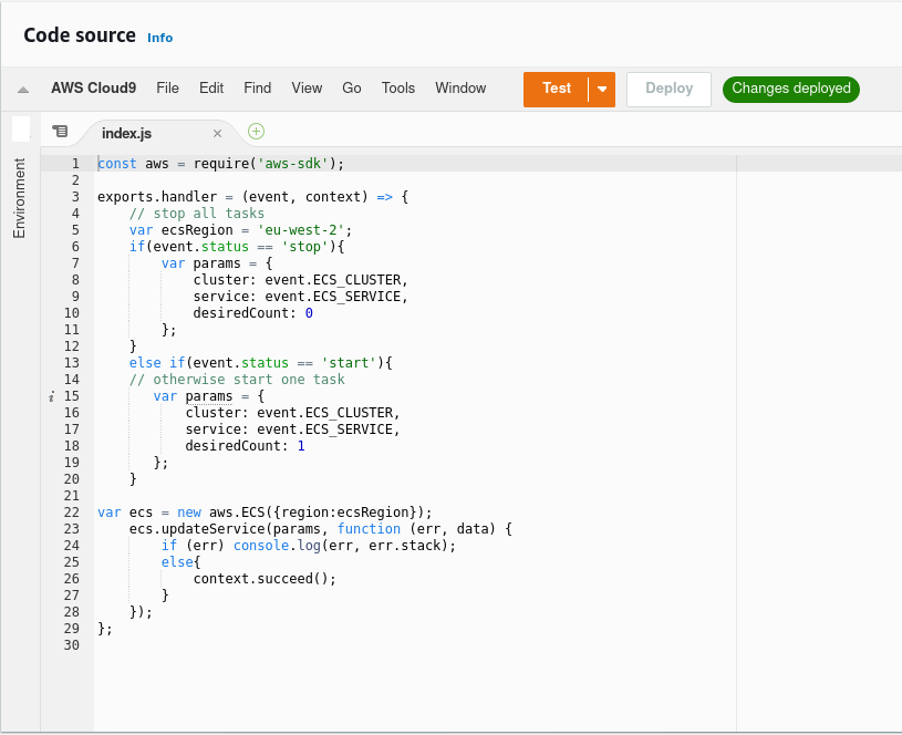 Using EventBridge I can set a Lambda function to trigger on a set schedule using a cron job to determine when these triggers should fire every day. This then trigger the Lambda function that will change the task count based on the JSON code supplied by the EventBridge rule.